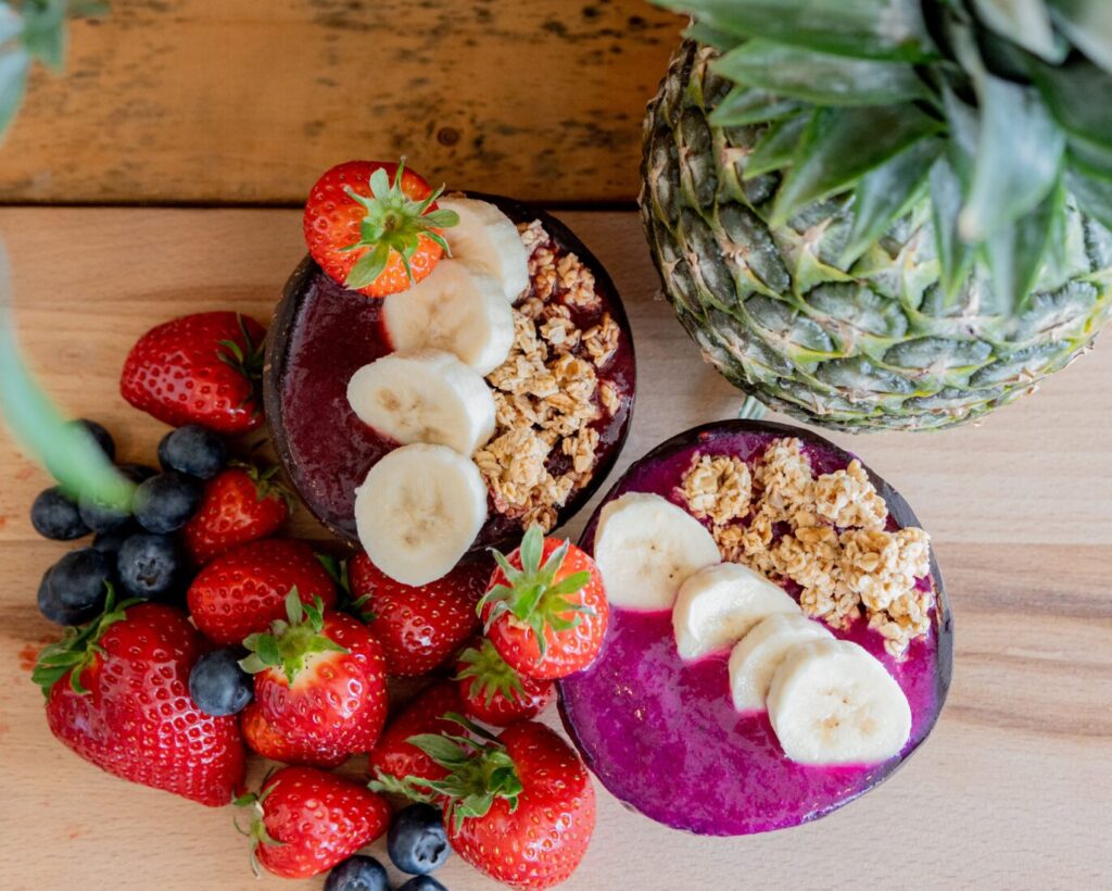 We kunnen de smoothiebowls serveren met verschillende toppings. Zo smaakt de Açaí Bowl het best met blauwe bessen en biologische granola. En bij de Pitaya Bowl en Matcha Bowl serveren we vaak biologische granola, banaan en kokos schaafsel.
